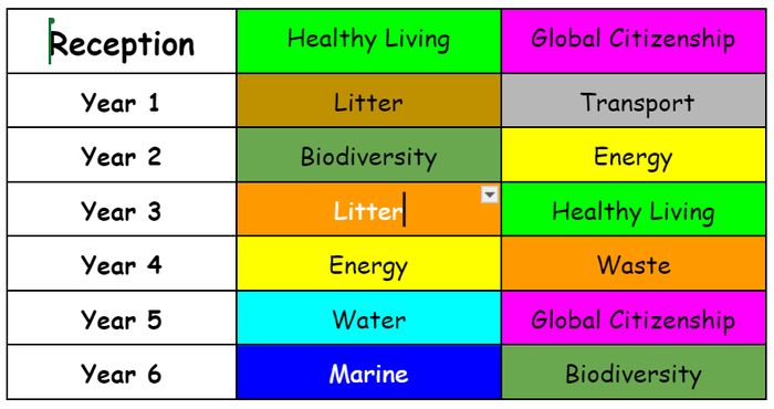 This year each year group will be incorporating the following areas of ECO schools into their learning. Look out for updates of their learning on the school Facebook and Twitter pages.